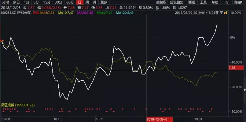 光线传媒股价与大盘对比(白线为光线传媒,黄线为大盘)