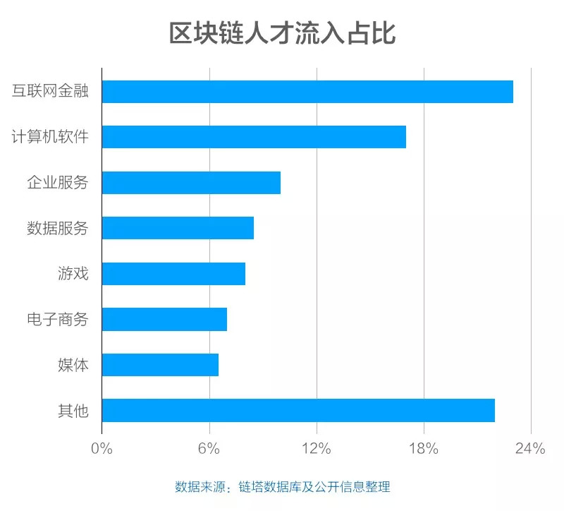 根据链塔智库与拉勾网联合发布的《2018中国区块链人才现状白皮书》中得出的结论,区块链行业人才流入比例中,来自互联网金融领域占比达到24%,占最高份额。通过人才流入的趋势来看,或许区块链是互金公司转型的新方向。