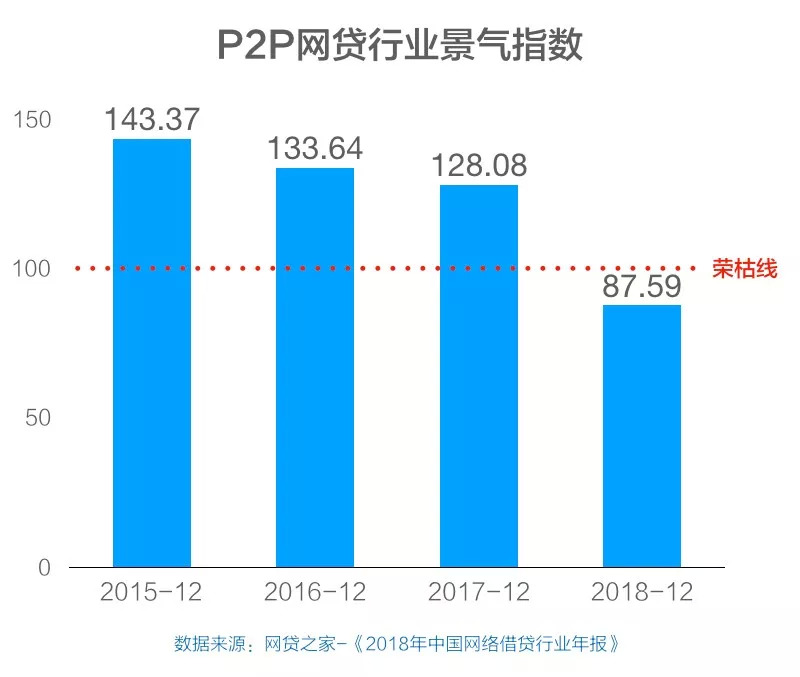根据网贷之家发布的《2018年中国网络借贷行业年报》的统计数据显示,整个P2P网贷行业景气指数在2018年呈拦腰式下滑,到达荣枯线以下。