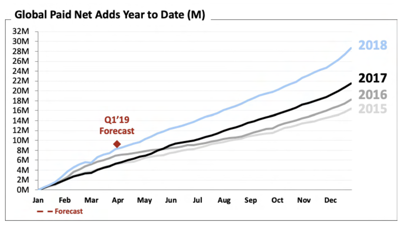 Netflix预测,2019年前三个月将增加890万订阅用户——160万本土用户和730万全球用户。该公司预计第一季度的收入增长率为21%,这已经算是大多数媒体公司喜闻乐见的速度,但却低于Netflix长期保持的30%以上的营收增速。