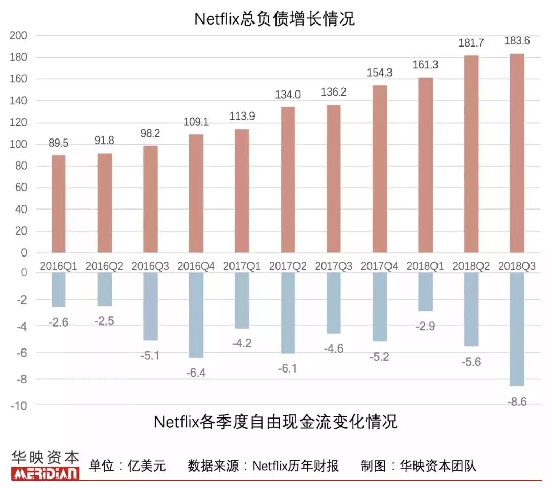 2018年,Netflix在原创内容上的投入可能高达130亿美元,2019年将会更多。而这样的投入基本上是依靠发债来完成的,这也直接导致Netflix连续多年自由现金流为负,这样的财务状况更是极其近似A股一家曾经以在线视频+影视生态为王牌的上市公司。