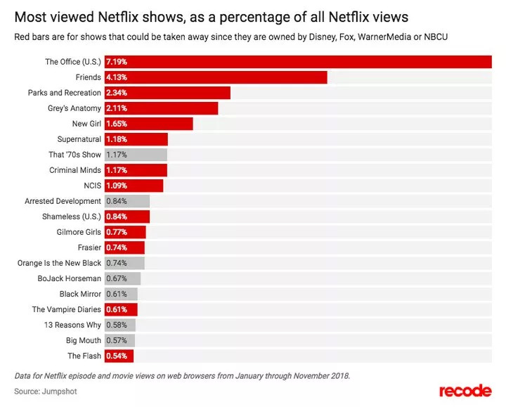 那么是不是因为Netflix自制内容虽然数量少,但是质量更高呢?也并非如此。Netflix上最受欢迎的剧集,大多数同样是来自各大影业公司,而并非Netflix本身出品。