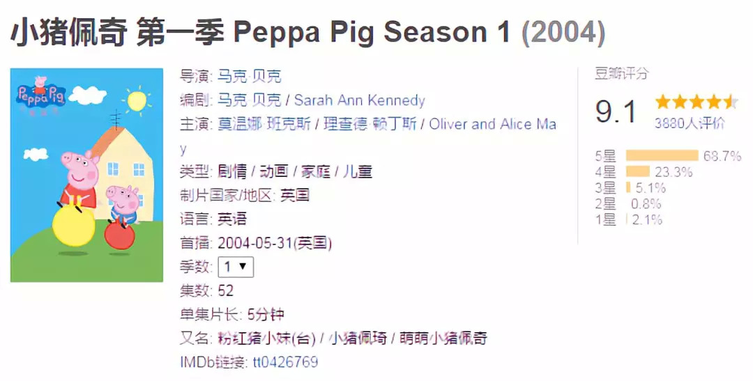 文艺小清新网站豆瓣上,佩奇系列的评分超过了9分。