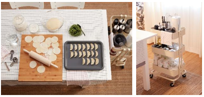 二、 加一个可移动的推车,放置食材、必要厨房小工具、调料以及厨房纸巾,而用完后则可以轻松推回厨房。
