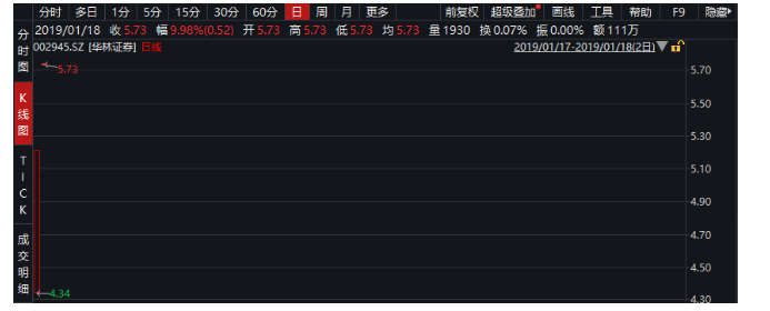 2019年1月17日,华林证券上市首日成交量32万股,成交金额164万元,股价涨幅高达43.92%。