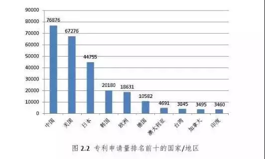 据DWPI数据库(德温特世界专利索引数据库)数据显示,全球范围内,人工智能领域的专利申请量总体上呈逐年上升趋势,在2010年后增长速度明显加快,近两年的增长率也不断提高。其中,申请量排名前三位的依次为中国、美国、日本。目前,中国在人工智能领域的专利申请数量达到76876件。美国以67276件的申请量略低于中国,日本位列第三。