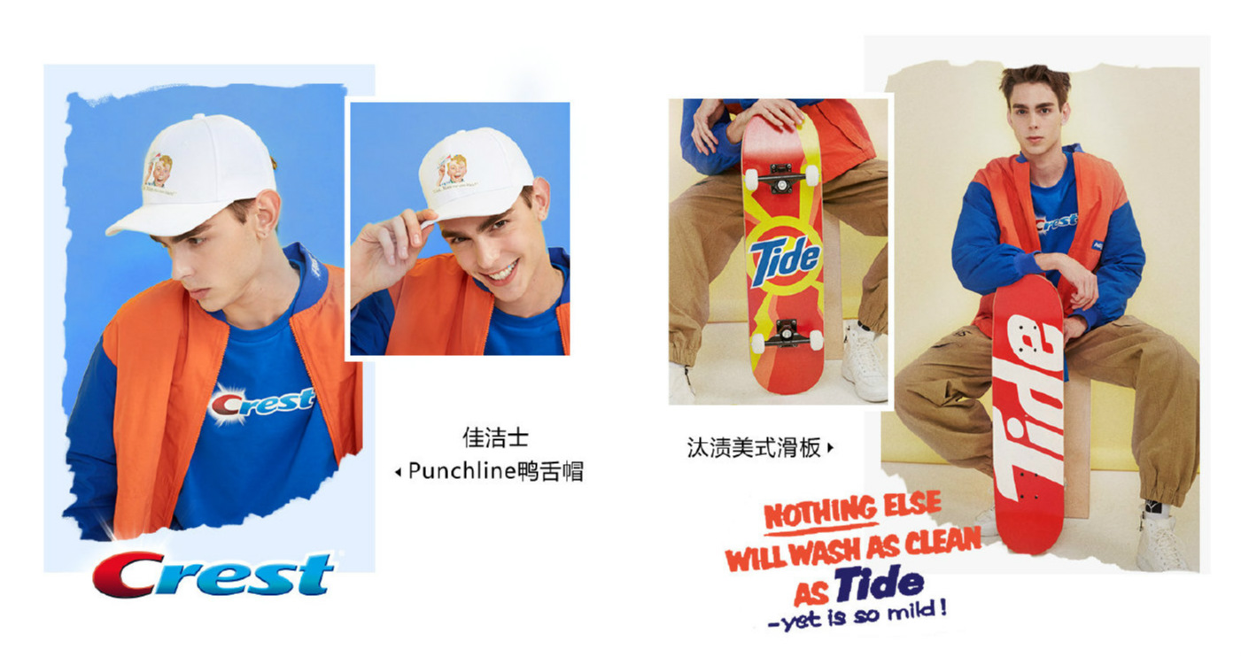 这次跨界,宝洁找来的合作方是它的老朋友、中国本土服饰品牌“太平鸟”。2018年11月,太平鸟就曾推出过它与宝洁的联名款服饰。从风格上看,宝洁这次的跨界像是上次双方联名的一个延续,只是在服饰外,还新增了手袋、滑板等周边产品。