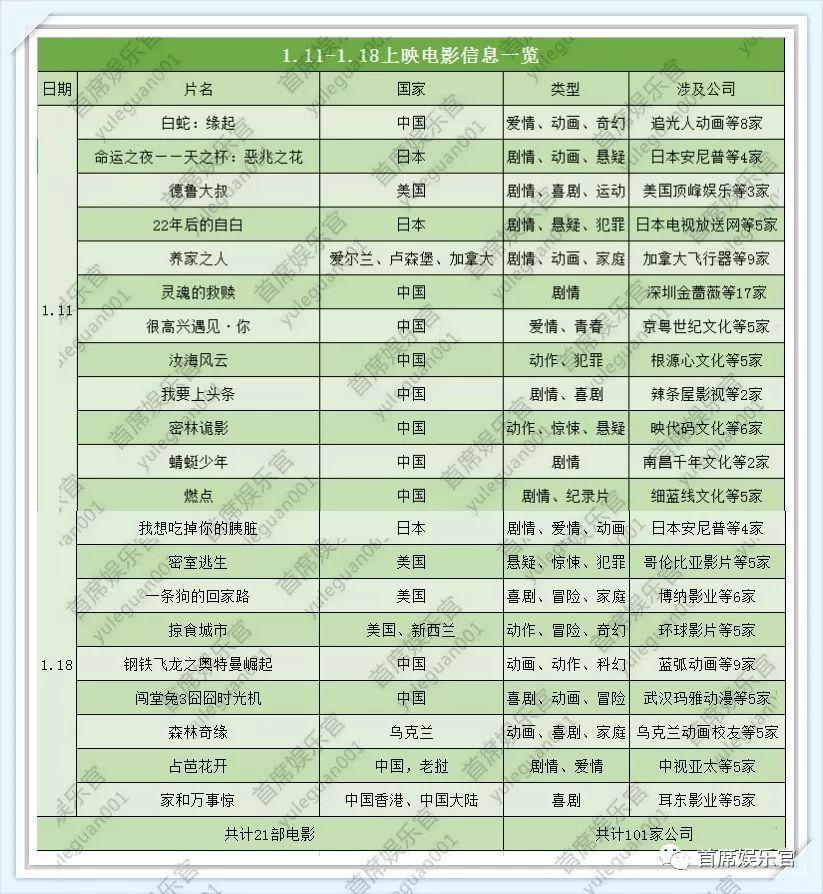 根据上述表格显示,1月11日至1月18日这8天时间里,21部定档的影片中共有9部进口片。其中,来自日本、美国的影片占了绝大多数。
