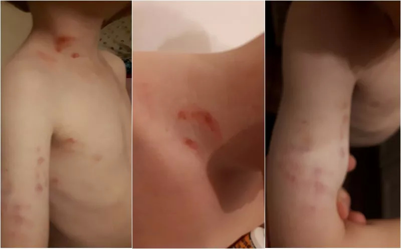 “晚上我给孩子洗澡的时候发现他的胳膊、脖子还有锁骨处都有伤,是抓伤和淤痕。撕掉脖子上的创口贴,我发现这里的伤口很深,看着像是用指甲抠出来的……”