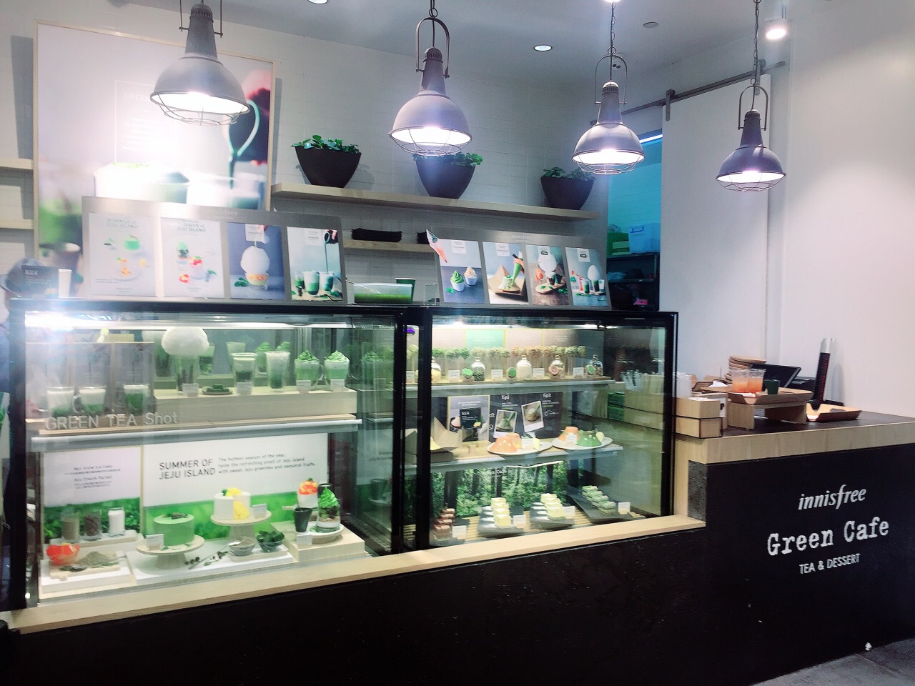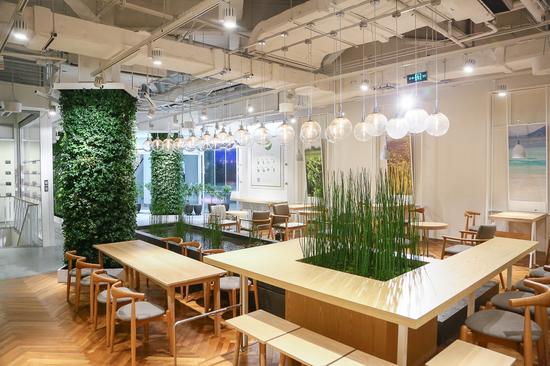 在韩妆悦诗风吟(innisfree)的上海旗舰店的二楼,咖啡区Green Café以及产品销售区也增加了消费者滞留时间,提升门店消费体验。空间设计的绿色自然风格以及济州岛特色的餐食甜点,更生动地体现了其品牌形象。