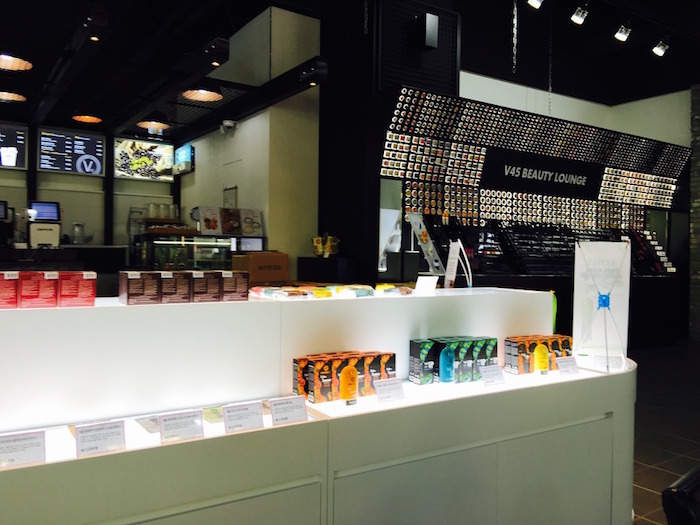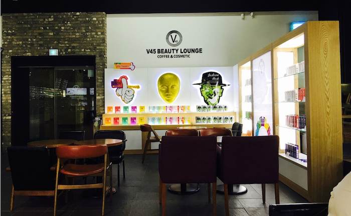 “V45 Beauty Lounge”咖啡店开在首尔麻浦区和道峰区,这里不只是一家贩卖咖啡及饮品的店铺,更是消费者试妆和购买美妆的据点。它由韩国ODM(Original Design Manufacturer,即做贴牌的企业)与OEM(Origin Entrusted Manufacture,即做代工的企业)的专营企业Ones经营,店内陈列的各种品牌美妆产品都是由Ones生产的,消费者可以自由试用与选购。