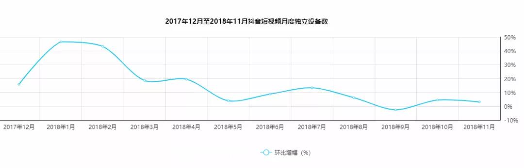 通过赞助春晚来试图突破眼下用户增长持续低迷的境况,是抖音不得不为之的策略。根据艾瑞网的数据,抖音的月独立设备数量增长持续收敛,徘徊在个位数,9月甚至出现下滑,如图: