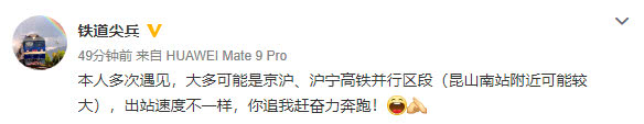 铁路局工作人员进一步解释,两辆车可能是南京南开出,复兴号走京沪线限速350公里每小时,和谐号开往合肥方向限速250公里每小时,这一段路刚好是两个线路并线,可能复兴号启动晚,或者是在等加速信号,一开始速度慢,加速后自然就超过和谐号了。