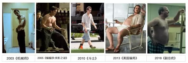 我们熟悉克里斯蒂安-贝尔是他曾经为了角色对自己身材进行了残酷的增肥与减肥,人们甚至将他亲切地称为“贝爷”。2003年,他为《机械师》中备受失眠困扰精神失常的角色减掉了60磅,只剩下一把骨头。紧接着又出演了《蝙蝠侠:侠影之谜》和《蝙蝠侠:黑暗骑士》中那个迷倒万千,浑身肌肉的超级英雄。在此之后再次迅速消瘦60磅,在《斗士》中饰演一位曾经辉煌一时如今却深陷毒瘾的著名拳击手迪克。然后再用一年的时间增肥,在《美国骗局》中饰演大腹便便的职业骗子埃文。