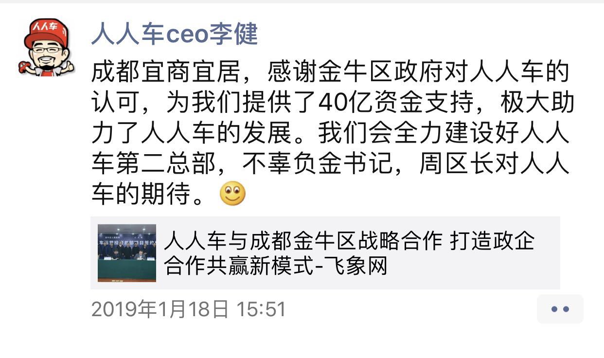 值得一提的是,1月18日,人人车创始人李健还曾在其朋友圈表示,感谢金牛区政府为人人车提供了40亿资金支持,极大助力了人人车的发展。