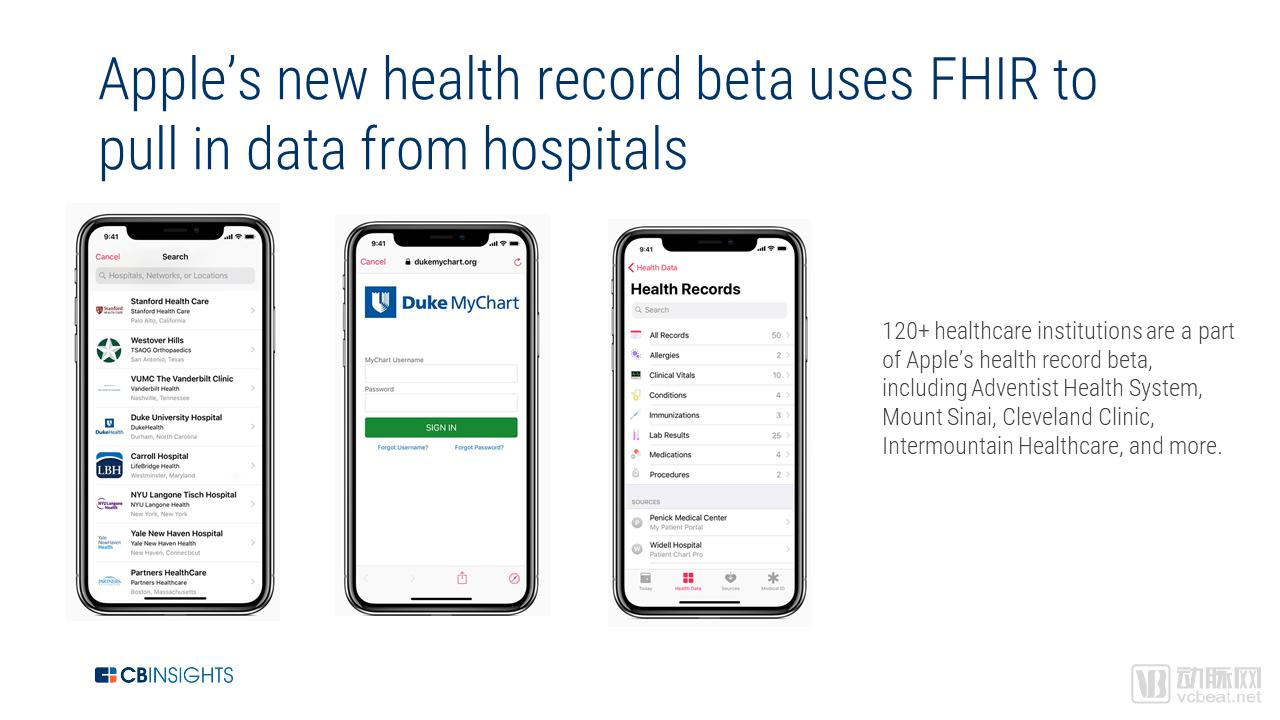 超过120家医疗机构成为苹果健康记录测试版的合作机构,包括Adventist医疗系统、西奈山、克利夫兰诊所、Intermountain healthcare、LabCorp等。据报道,该公司还与初创公司Health Gorilla合作,后者帮助医生订购和消化实验室测试数据。