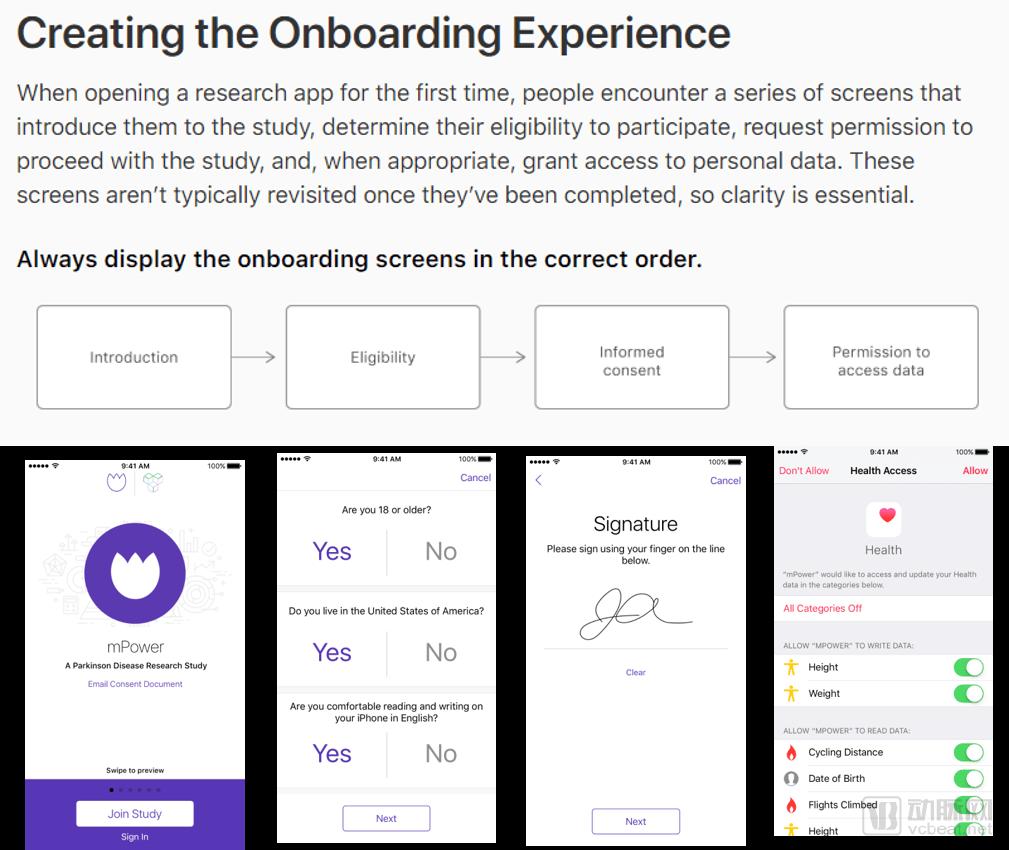 3.简化参加学习的过程。ResearchKit正在简化研究的流程,使用可定制的模板引入研究、理解合格标准、获得知情同意和数据访问权限。对于患者来说,带有yes/no问题、视频和患者小测验的知情同意书更容易帮助其理解他们正在注册什么。