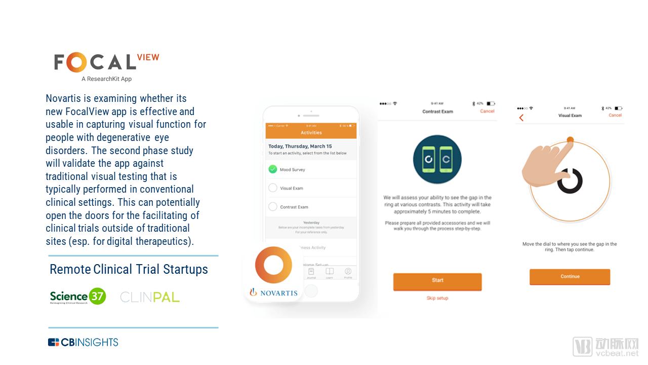 诺华在FocalView上更进一步地进行研究,FocalView应用允许研究人员通过手机上的自我报告和工具实时监控眼疾进展。第一步是评估应用程序判断视觉功能的能力,如视力和对比敏感度。下一步是通过ResearchKit远程验证将数据采集到常规临床环境中的传统测试。这为使用ResearchKit进行远程临床试验奠定了基础。