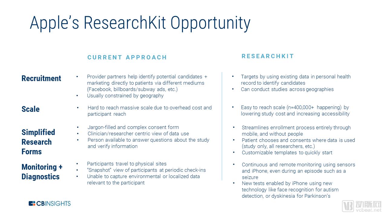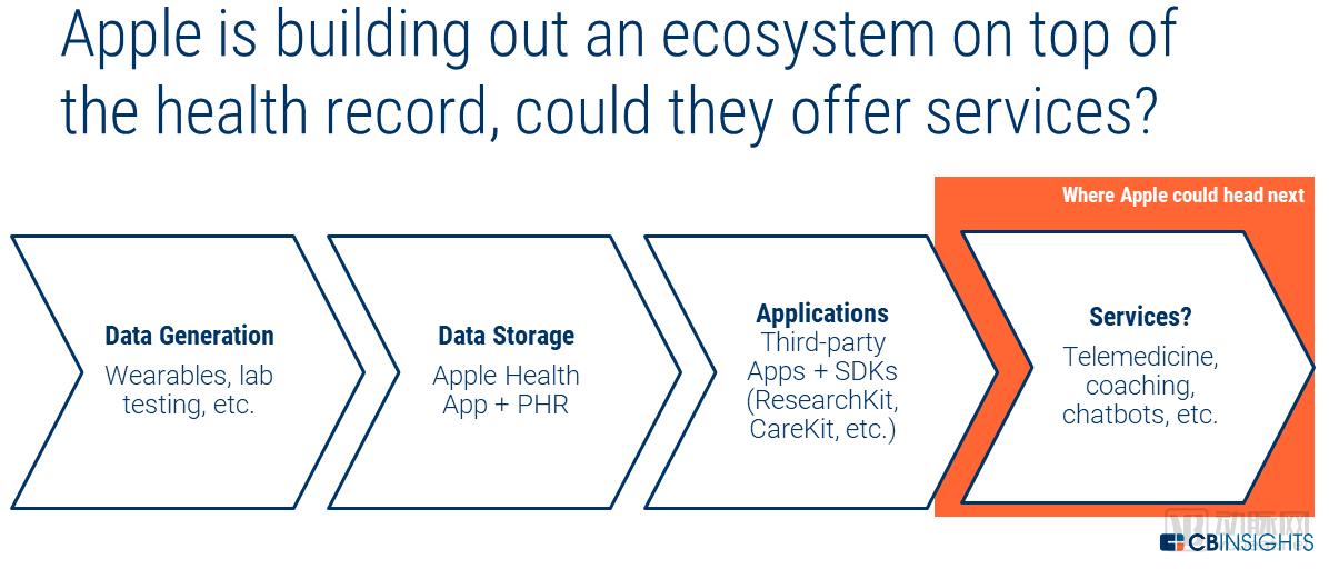 根据CBinsights的观点,随着苹果的Health Record和带有单导联心电图的Apple Watch发布,Apple显然已经正式进入医疗保健领域。