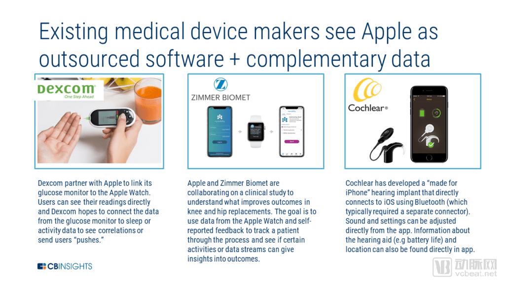现有的医疗设备制造商已经开始构建专门设计用于Apple产品的设备。这些公司专注于用户体验,且借助苹果的品牌,通过iPhone、Apple Watch等进行数据捕获。