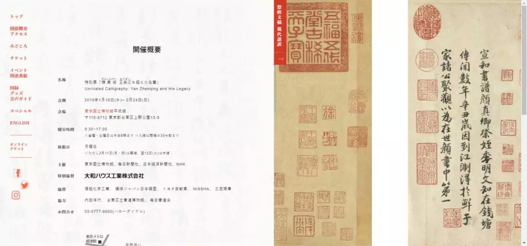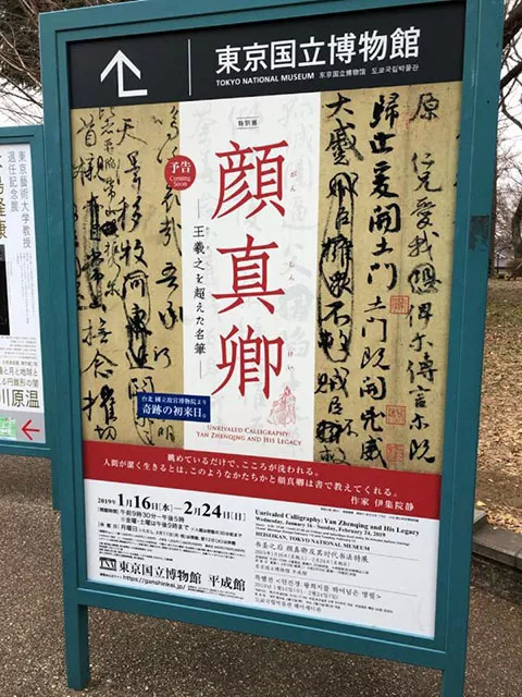 根据东京国立博物馆的展讯,特別展「顔真卿 王羲之を超えた名筆」(颜真卿超越王羲之的名笔)将在日本东京博物馆平成馆特别展示室展出。展出时间为1月16日至2月24日。主办方为东京国立博物馆、每日新闻社、日本经济新闻社和NHK,由大和ハウス工業株式会社特别赞助,协办方为内田洋行、台北故宫博物院和每日书道会。