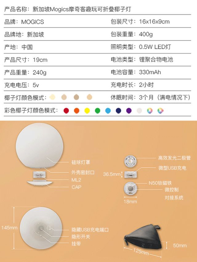 智黑科技专营店新加坡 Mogics(摩奇客) 趣玩可折叠椰子灯小程更多产品细节