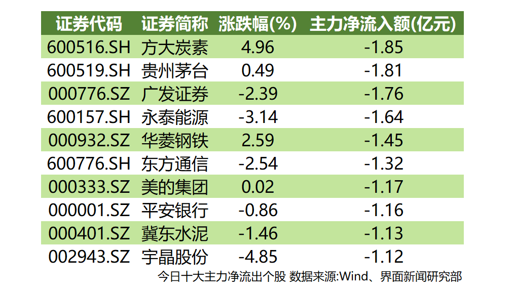 沪深两市共计13只个股主力净流出额超1亿元。方大炭素(600516.SH)、贵州茅台(600519.SH)、广发证券(000776.SZ)的主力净流出额位居前三,分别是1.85亿元、1.81亿元、1.76亿元。前期大热个股东方通信(600776.SH)连续三日下跌,遭遇1.32亿元主力资金抛售。