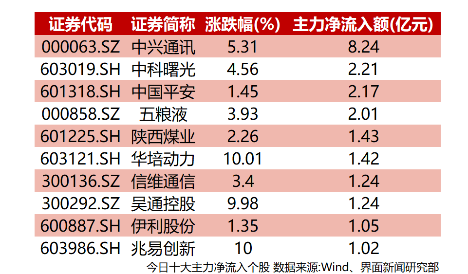 剔除尚未开板的新股,全天沪深两市主力净流入额超过1亿元的个股数量为10只。中兴通讯(000063.SZ)、中科曙光(603019.SH)、中国平安(601318.SH)的主力净流入额位居前三,分别是8.24亿元、2.21亿元、2.17亿元。半导体表现不俗,龙头兆易创新(603986.SH)获得1.02亿元主力资金买入涨停。