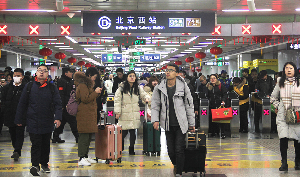 春运第一天,客流并未明显增多。北京西站预计客流高峰期为1月26日-2月3日(腊月二十一至二十九),日均旅客发送量22万人左右,高峰日预计形成于2月1日-3日,单日旅客发送量可能超过25万人(与去年持平)。春运期间,北京西站增开旅客列车32.5对,其中高铁列车12.5对,主要开行方向为:成都、重庆、武汉、西安、郑州、南昌、阜阳等。