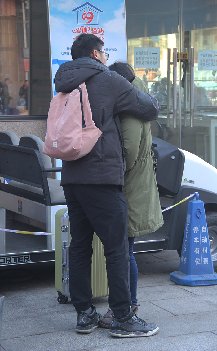 在北京西站售票大厅门口,杨磊刚改签完。他本来买的1月23日的车票,但在网上查了一下今天还有到太原的余票,于是直接到火车站来改签提前出发。杨磊去年刚大学毕业,现在北京工作还处于试用期,工作上事情不多便提前请假回家了。她的女朋友特地到火车站来送他。