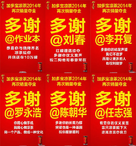 继上述2013年“对不起体“之后,4月加多宝又推出“多谢体”,先是登报向香港、东莞、四川、北京四地致以感谢,后又在微博上推出了一系列“多谢大V”营销活动——由加多宝官微发出针对每位大V不同的致谢海报后,再由大V给予转发互动,但这次营销在被大V@作业本转发时却由于受到此前@作业本在2013年的一条微博被网友指责羞辱烈士而匆匆告终。