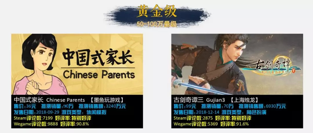 “黄金级”则由《中国式家长》和《古剑奇谭三》获得。其中,《中国式家长》推测销量为90万,销售额为3240万元;《古剑奇谭三》推测销量为70万,销售额为6930万元,这也是上榜的18款最畅销新游中收入最高的。此外,这两款游戏在Steam平台上的好评率均为“特别好评”,在Wegame平台的好评率均达到90%以上。