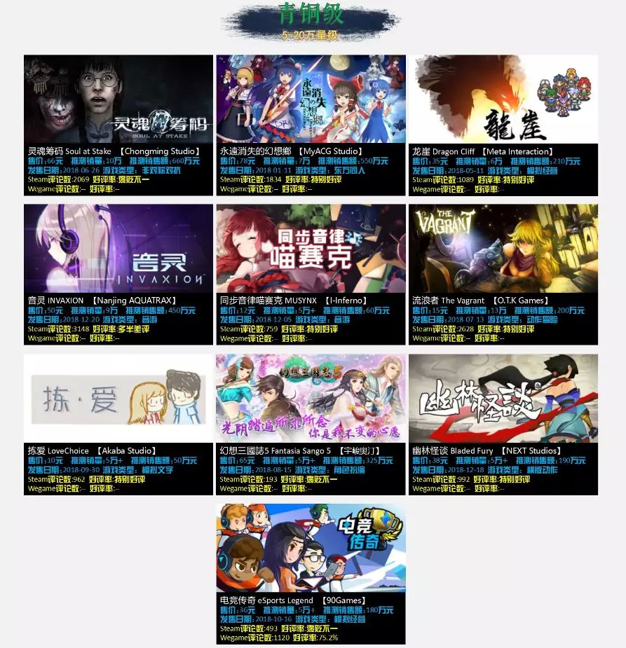 按照销量划分,“国游销量”将超过100万量级称为“铂金级”,50-100万量级为“黄金级”,20-50万量级为“白银级”,5-20万量级为“青铜级”。