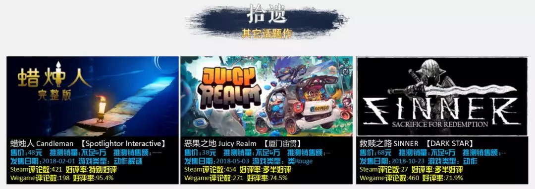 此外,销量不及“青铜级”但话题性较足的“拾遗”作品一共有3款,分别是《蜡烛人》、《恶果之地》和《救赎之路》。这三款游戏的推测销量均不足5万,但是却获得了较高的好评率,颇有“叫好不叫座”的遗憾。