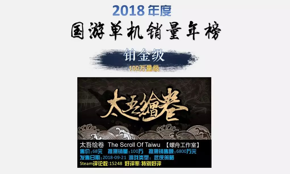 二、2018年《太吾绘卷》销量超过100万,《古剑奇谭三》销售额超过6900万