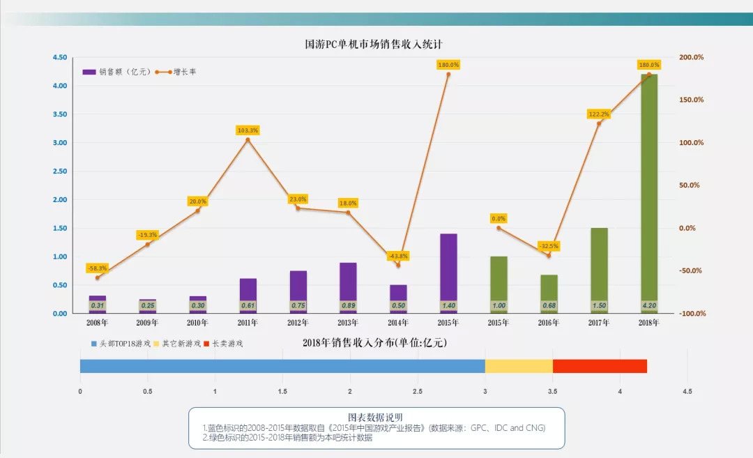 一、2018年国产单机游戏总销售额约为4.2亿,同比增长180%