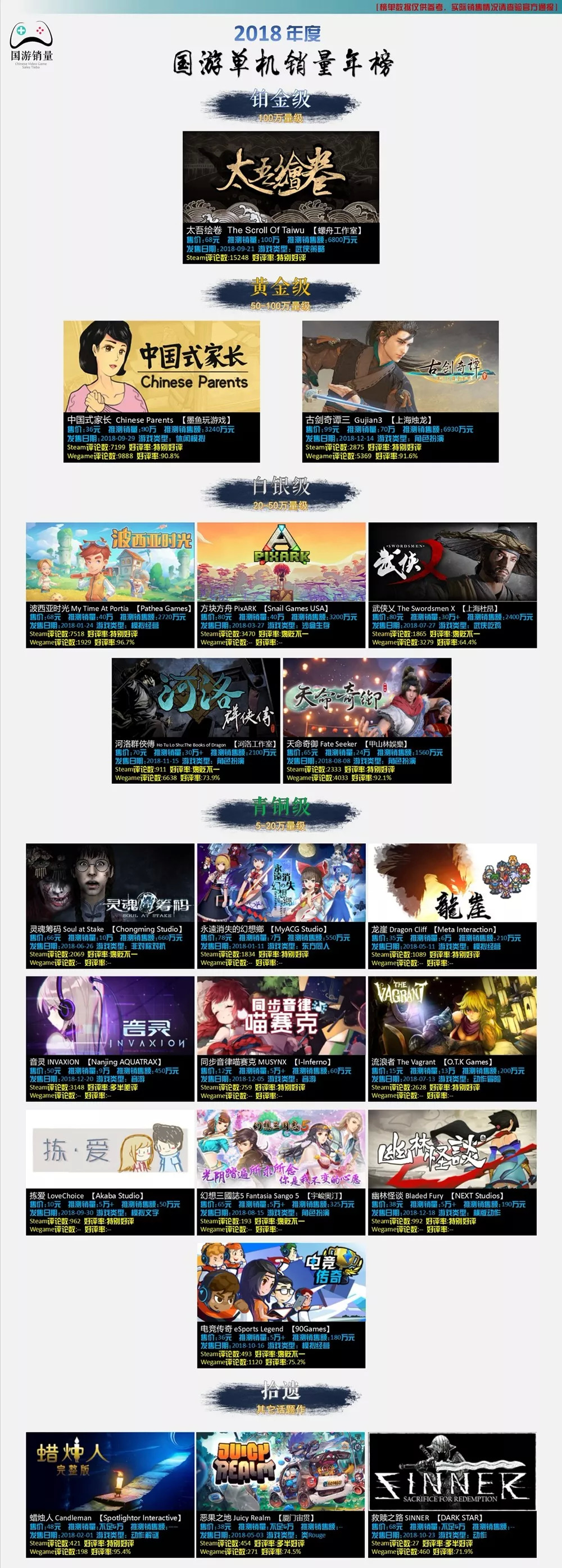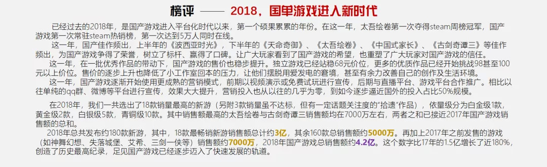 在最后,“国游销量”也给出了榜单评价,称2018年国产单机游戏进入了新时代。“在这一年里,《太吾绘卷》夺得了Steam周榜冠军,国产单机游戏第一次常驻Steam热销榜,第一次达到5万人同时在线。”