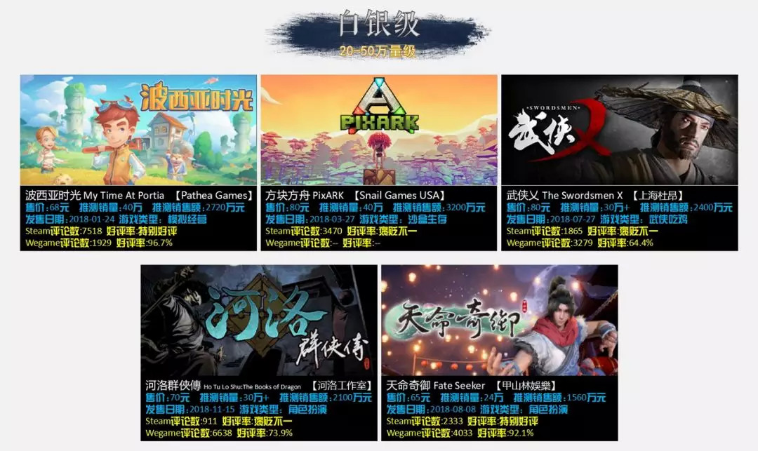 位列“白银级”的一共有5款游戏,分别是《波西亚时光》、《方块方舟》、《武侠乂》、《河洛群英传》和《天命奇御》。值得一提的是《波西亚时光》,这款模拟经营类游戏于2018年年初上线,直到不久前才完成正式版的发布,即便如此也在过去一年取得了40万的销量成绩,实属亮眼。
