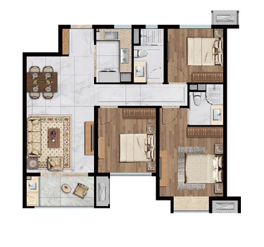 而就约102㎡户型来说,最值得一提的就是百米空间配置两卫,这样在晨起和夜晚休息时,就可以避免与家人在洗漱方面所发生的矛盾。