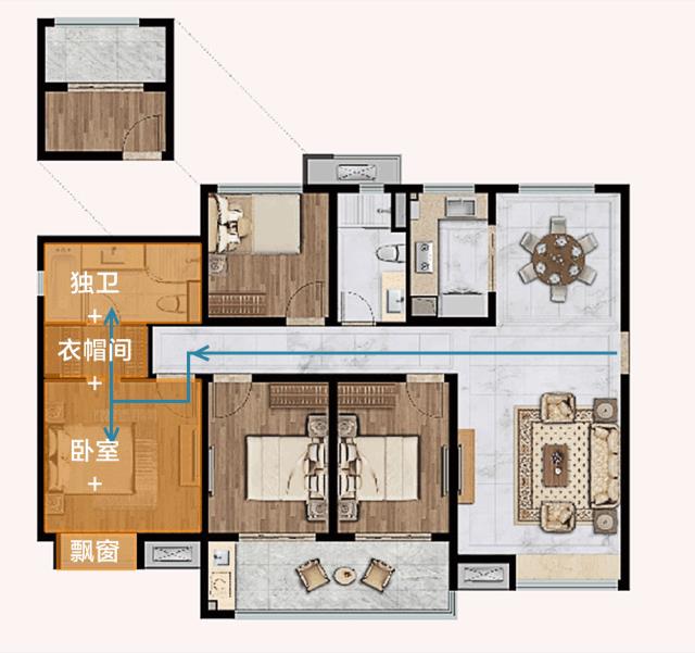 而就约143㎡四房中,约1/3的空间都分配给了主卧,独立衣帽间、四件套独立卫生间,这样的布局,能够让主人更体面的享受生活。