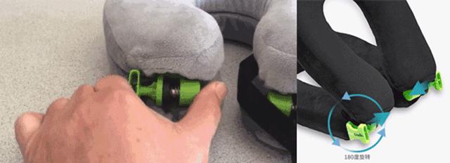 同时,上下两层的U型枕头,内部则是两根坚硬的金属框架与一个可180°调节的锁扣组成。