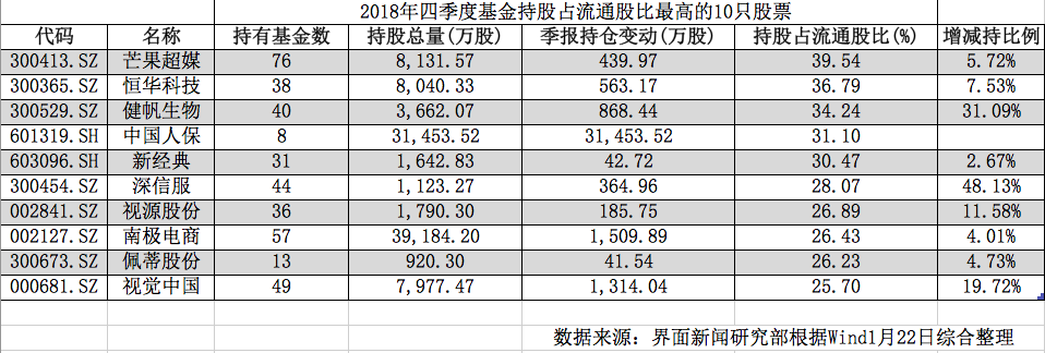 值得注意的是,公募基金对前十大持股占流通股比最高的股票均有所增持,整体控盘度明显提高,流通股占比最低的视觉中国(000681.SZ)也占到了近27%。
