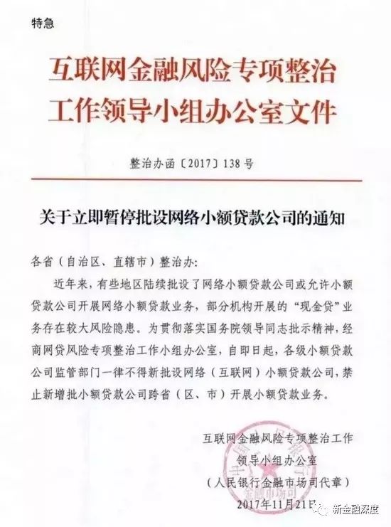 事实上,关于网络小贷的申请,监管的口风处于严谨状况。2017年11月,互联网金融风险专项整治工作领导小组办公室发文《关于立即暂停批设网络小额贷款公司的通知》(简称《通知》),明确指出“从即日起,各级小额贷款公司监管部门一律不得新批设网络小额贷款公司,禁止新增批小额贷款公司跨省(区、市)开展小额贷款业务”