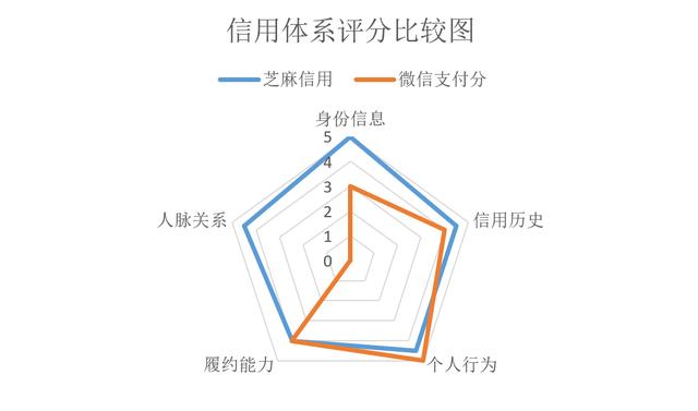 一是评分体系究竟谁优谁劣?根据网上公布的数据,微信支付分的评分依据主要来自于身份特质、支付行为、守约历史等等情况,相比于芝麻分综合考虑了个人用户的信用历史、行为偏好、履约能力、身份特质、人脉关系五个维度的信息,微信支付分似乎简单许多,那么到底谁优谁劣呢?我们不妨用李克特五点法配合雷达图做一个比较。根据信用体系评分比较图我们可以发现: