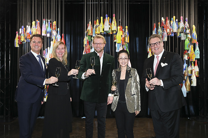 整个装置艺术展由200个手绘香槟瓶组成,Alexander Hall以明快流畅的滴画风格,展现出每一家洲际酒店的特质与个性,其中包括刚刚开业的上海佘山世茂洲际酒店。