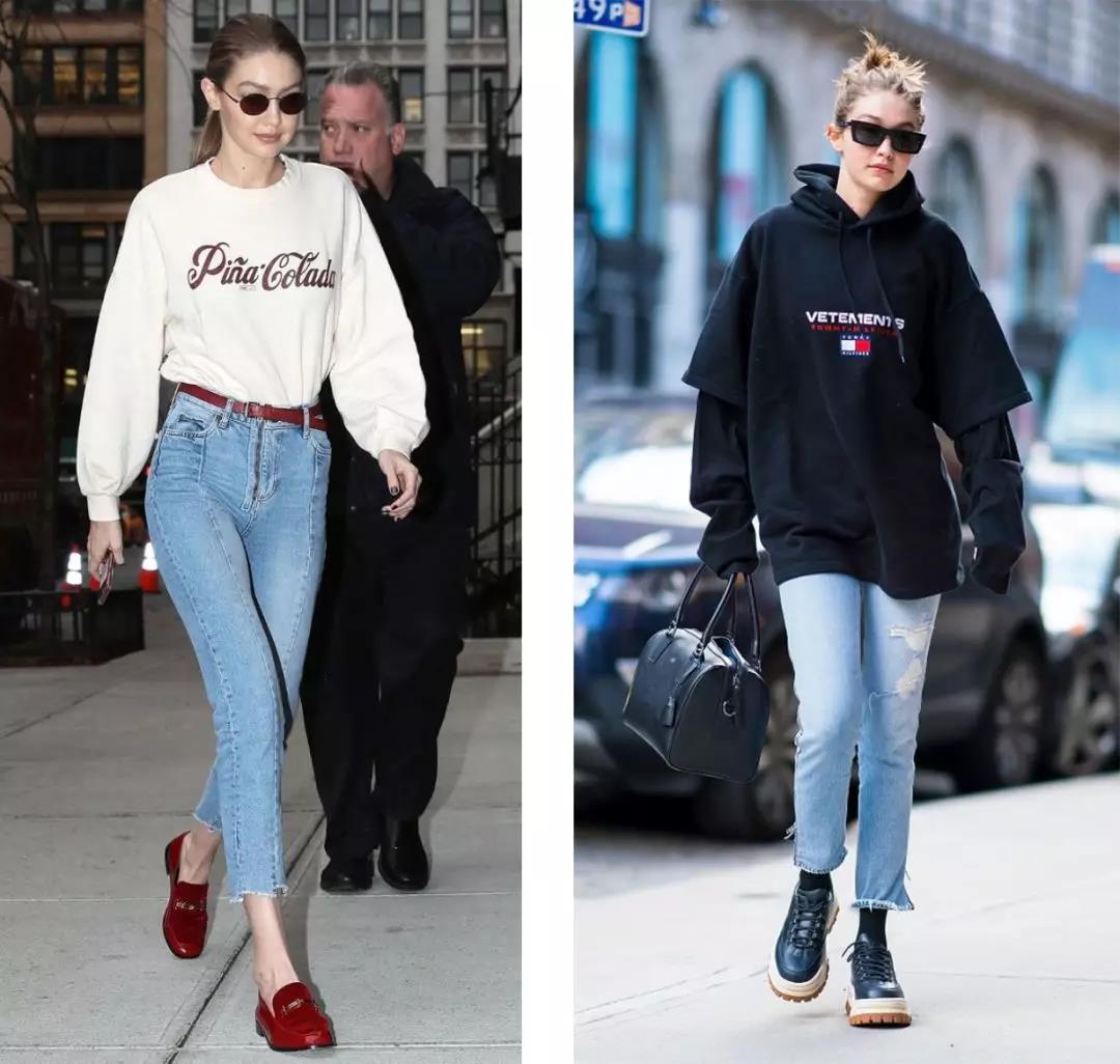 Gigi Hadid的几次神仙搭配都是卫衣+牛仔裤,卫衣收进裤子就可以营造高腰效果,比较精神,放出来就随意一些,根据搭配的鞋子还不同可以营造出不同效果。所谓经典搭配肯定是有理由的。