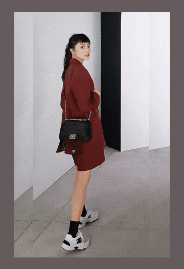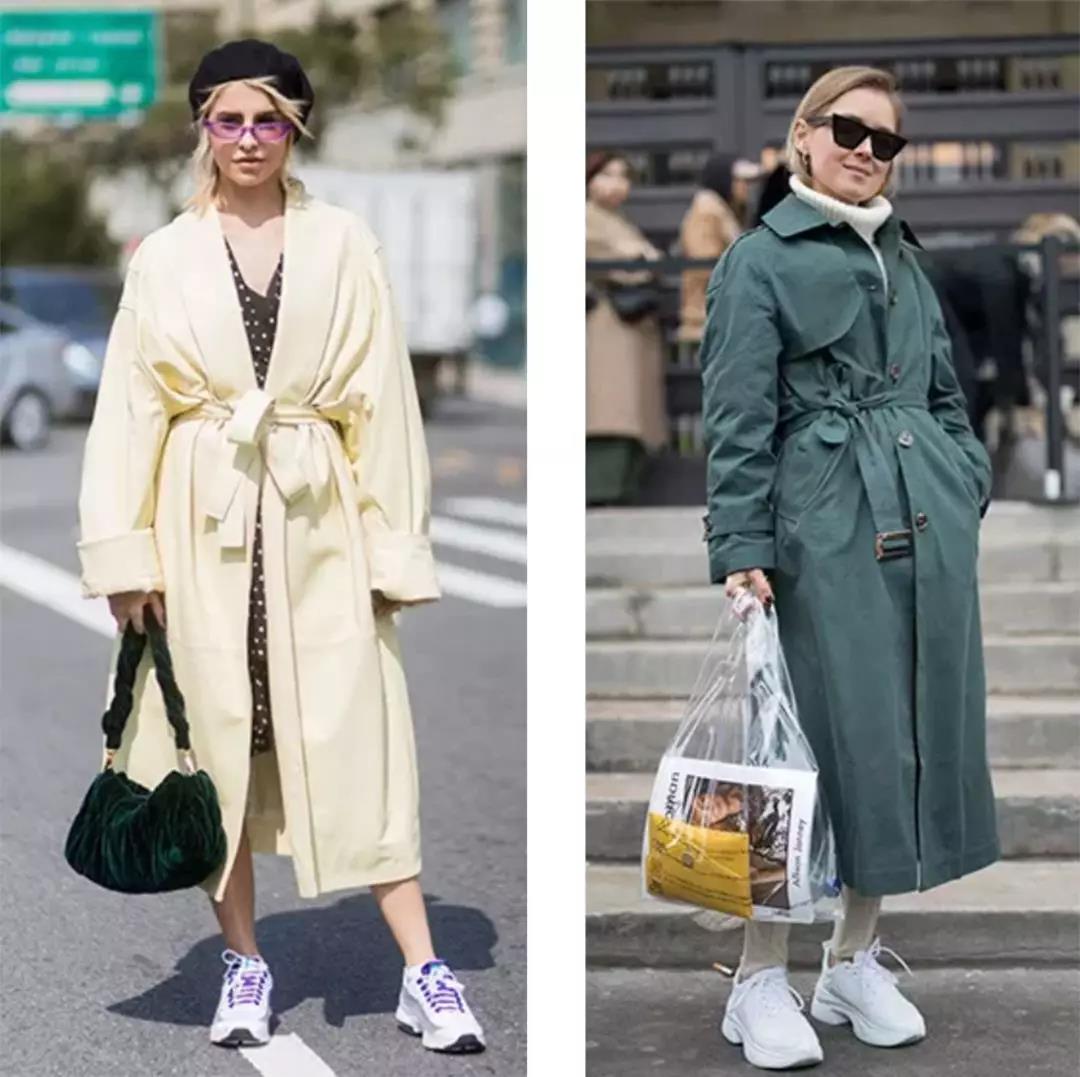 搭大衣就有一种帅气利落的感觉,利用大衣腰带打造高腰线的同时衣摆和运动鞋中间露出一截最纤细的小腿肚部分,超级显瘦。