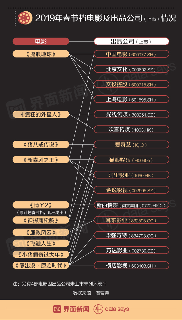 从出品公司来看,猫眼娱乐、阿里影业、金逸影视等15家上市公司在春节期间多有布局,分别出品了至少两部电影。