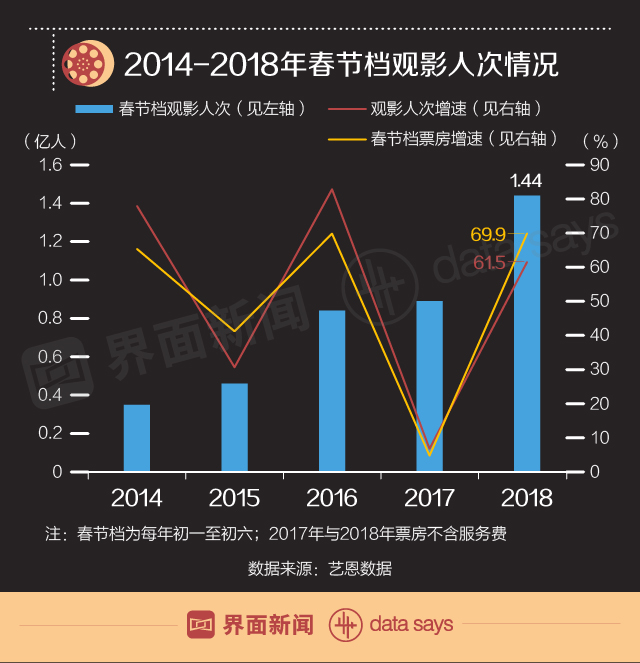 艺恩数据显示,2018年,春节档观影人次首次突破1亿。从增速情况来看,2018年春节档观影人次增速虽达61.5%,但被票房增速反超(上一次发生在2015年)。