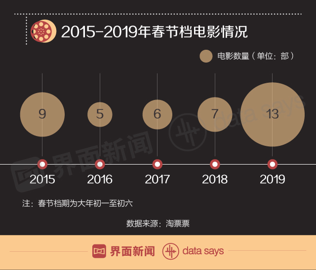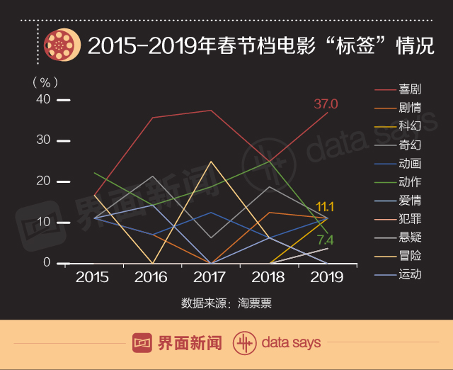 淘票票数据显示,2019年定档春节假期的影片共计13部,远超近5年水平。据界面数据(公众号ID:tuli_shuju)梳理, 喜剧类电影仍是2019年春节档的重头戏,喜剧标签的出现率达37%。